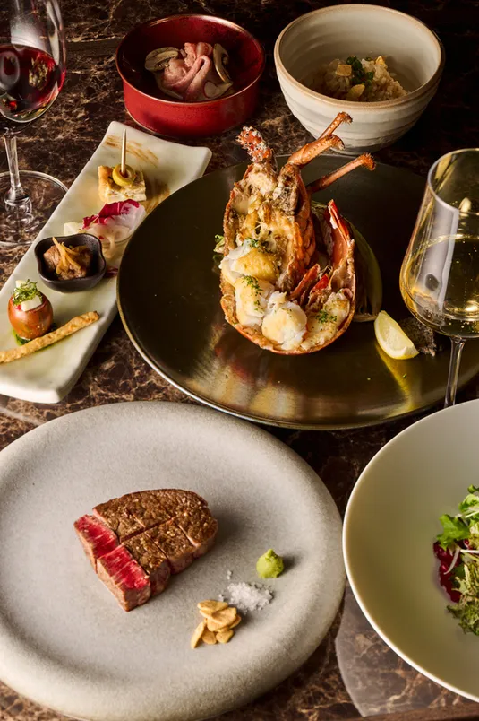 【美安-viande-コース】A5等級黒毛和牛シャトーブリアンなど3部位食べ比べ / 国産大伊勢海老or大タラバ蟹 / フォアグラ / 至高全9品〈デザートプレート&乾杯スパークリング付〉 -川崎鉄板焼き-